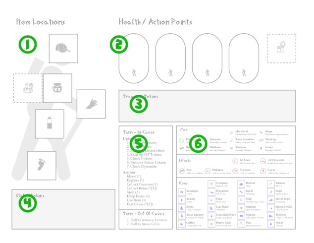 | 1 | Item Locations | These represent the various Item Locations where the Items that the spelunker finds will be stored. These locations are the Head, Pack, Hands, Canteen, and Feet. Spelunkers begin the game with one Pack location, but may unlock another if they find the Heavy Pack; they then place the Heavy Pack token in the provided dashed space, where it becomes available as an additional Pack location. Items with Location specifiers on them must be placed into the indicated Location in order to be Active, meaning that the spelunker may use the item during their turn. Any Item, regardless of Location specifier, may be carried in the Pack or Hands; those without Location specifiers will be Active. For example, Boots must be worn on the Feet in order to be useful, but a spelunker could store their Boots in their Pack for later if they wished. |